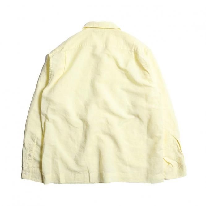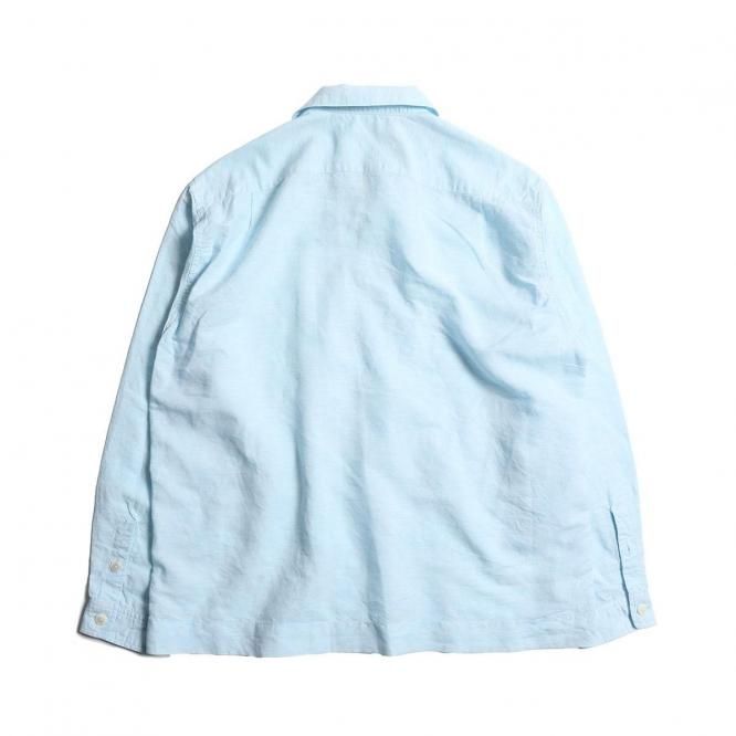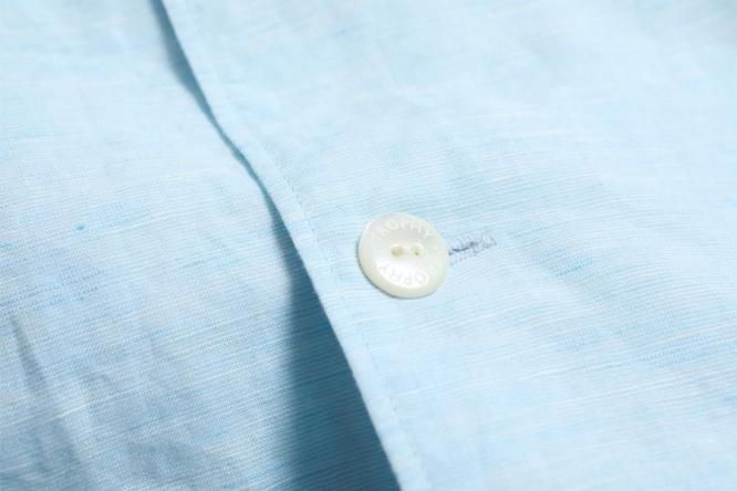 ウイング形状に開いたイタリアンカラー、ウエストポケット、オリジナル刻印ボタン、裾のあき等、このシャツならではのディテールが特徴。