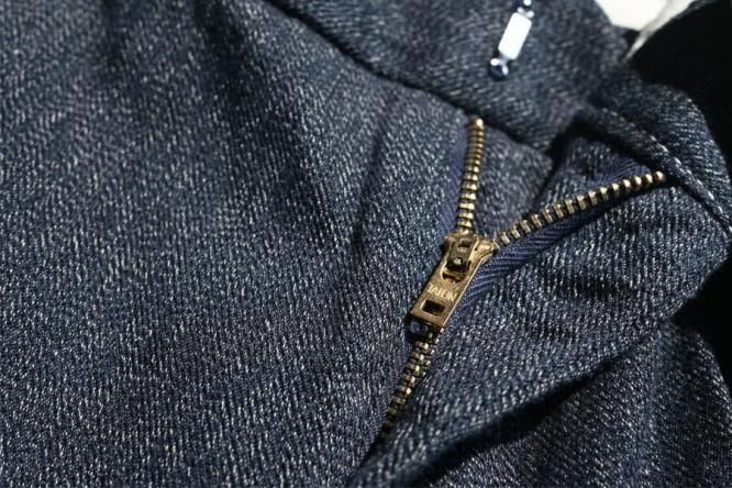 広めのワタリと裾幅、深い股上を持つシルエット、洗いを掛けて目の詰まったコットン、大きく波打つパッカリングも風合いを引き立てます。